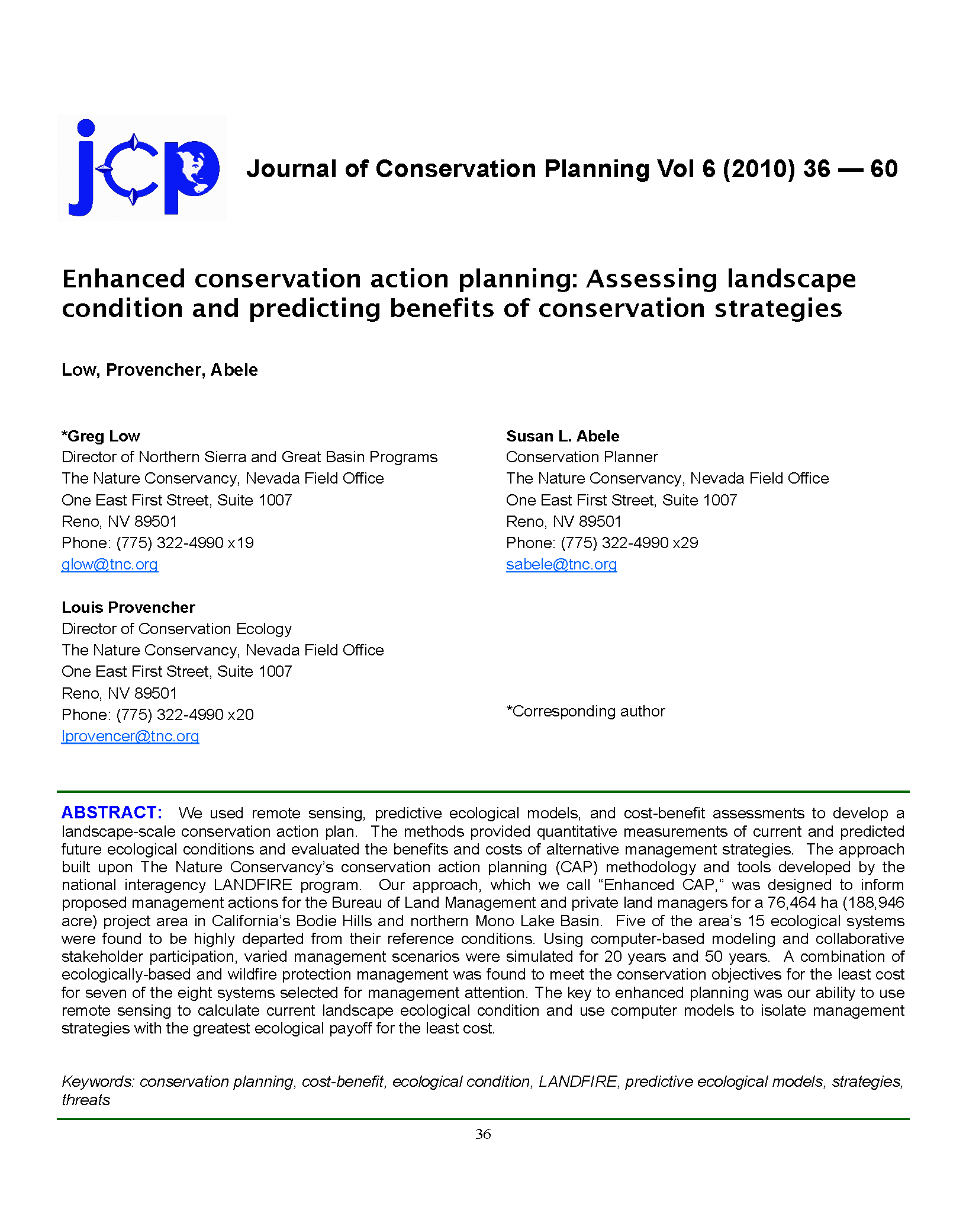 Low G, Provencher L, Abele S. 2010. Enhanced conservation action planning: Assessing landscape condition and predicting benefits of conservation strategies. Journal of Conservation Planning 6:36-60.