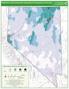 This map summarizes data from the Nevada Indicators of Groundwater Dependent Ecosystems (iGDE) database that was completed in 2019. In Nevada, groundwater is administered in 256 hydrographic areas, so this map shows how many miles of groundwater-dependent rivers and streams each hydrographic area contains, with darker hydrographic areas indicating more GDE rivers and streams. See the Nevada iGDE story map for more information.