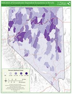 This map summarizes data from the Nevada Indicators of Groundwater Dependent Ecosystems (iGDE) database that was completed in 2019. In Nevada, groundwater is administered in 256 hydrographic areas, so this map shows the percent cover of groundwater-dependent wetlands each hydrographic area contains, with darker hydrographic areas indicating greater percent cover of GDE wetlands. See the Nevada iGDE story map for more information.